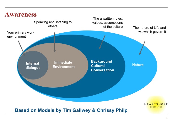 What Tim observed was that when we interact with the world around us we are operating in 3 main contexts which overlap and interact with each other. The first is our individual world, where our internal dialogue is running all the time, trying to make sense of the world around us (in practice there is more going on at this individual level as it is also informed by our emotions, our senses and our intuition. It is only through this individual level that we are able to process changes in the other environments or change and adapt. The Immediate Environment is all the people we are interacting with day to day who provide us with awareness about the world immediately around us. The third circle is the broader environment of all the unwritten rules, values and assumptions which permeate the broader environment. Since these three contexts provide information which is intangible it is difficult for us to create accurate pictures of them and they are also continually in flux which means that we are always updating these pictures or at least, we need to in order to be able to relate effectively to our environment. Tim Galwey’s point was that the greater our awareness of these three environments the more skillfully we are able to respond to them. It is obvious that if we are unaware of something then we cannot respond to it. The last sphere is Nature and this comes from an essay by Chrissy Philp where she put forward a model similar to Galwey’s but which included this sphere of Nature and a further sphere of Cosmos beyond Nature.